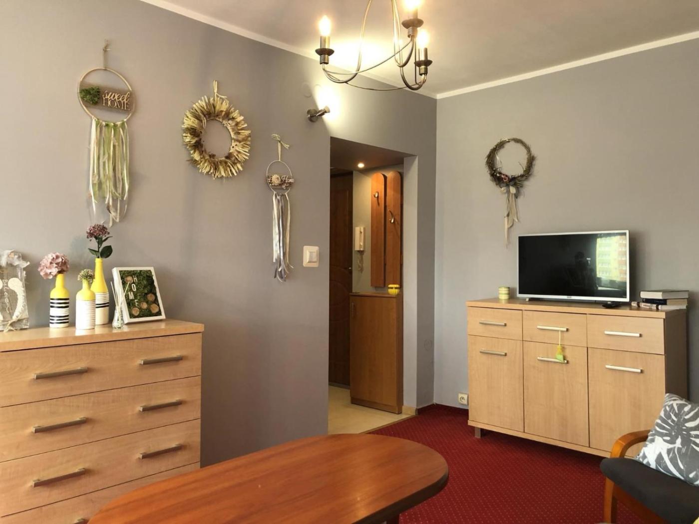 Apartament z 1 sypialnią. Boasting a private entrance, this apartment includes a kitchen, 1 bedroom and 1 bathroom with a bath and a shower. The fully equipped kitchen features a stovetop, a refrigerator, kitchenware and an oven. This apartment has a washing machine, flat-screen TV with streaming services, city views, as well as chocolate for guests. The unit has 1 bed. Apartament - 2 osobowy. Powierzchnia pokoju ok.: 27 mkw.
